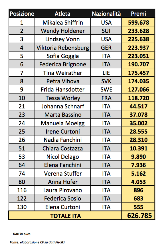 Se la Goggia ha fatto segnare la migliore prestazione economica quanto riguarda i premi in questa stagione, a livello generale in testa rimane Federica Brignone: la 27enne milanese ha infatti conquistato 680mila euro dal 2012 ad oggi, con tutta la nazionale femminile italiana che ha vinto 2,4 milioni di euro.