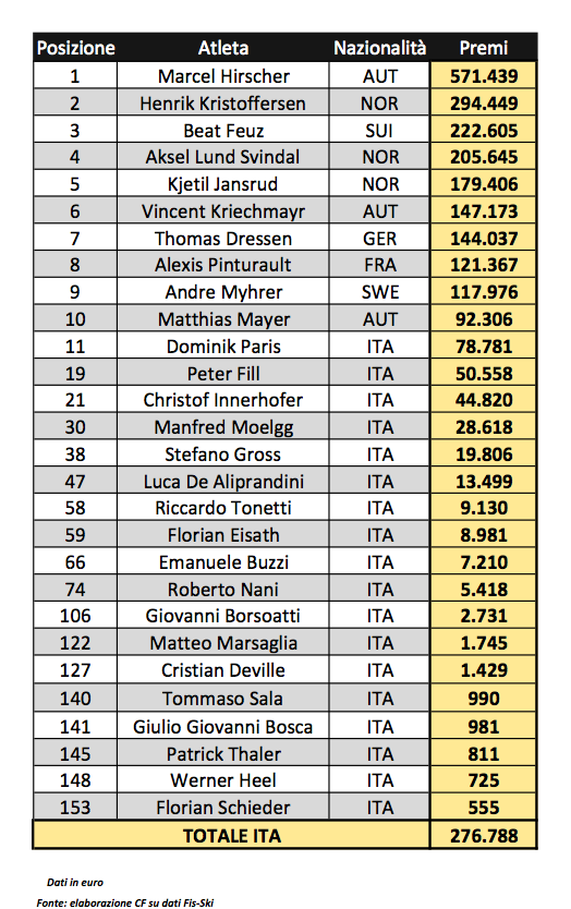 Prima nella speciale classifica dei premi conquistati è il dominatore della Coppa del mondo generale, l’austriaco Marcel Hirscher, che nella stagione del suo settimo trionfo ha portato a casa anche oltre 571mila euro. Nessun italiano nella top10: Dominik Paris ha chiuso 11° con 78mila euro, Peter Fill 19° con 50mila euro, davanti a Christof Innerhofer 21° con 44mila euro. Per Paris, l’incasso maggiore è arrivato dalla vittoria a Bormio, che gli ha fruttato 45mila franchi svizzeri (poco meno di 40mila euro).