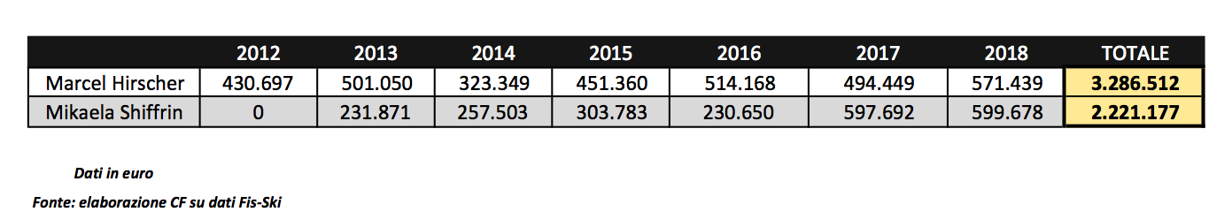 Montepremi comunque non paragonabile ai big assoluti: i due dominatori (a livello economico ma non solo) delle ultime stagioni, Marcel Hirscher tra gli uomini e Mikaela Shiffrin tra le donne, hanno conquistato infatti complessivamente 3,2 e 2,2 milioni di euro dal 2012 ad oggi, quasi quanto l’intera nazionale maschile e femminile.