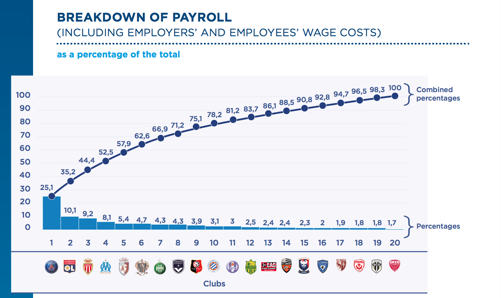 Come per i ricavi, anche per i costi i club più importanti raccolgono le cifre maggiori: il Psg da solo vale il 27,7% dei costi complessivi, con i primi sei club che valgono circa i 2/3 dell’intera Ligue 1.
