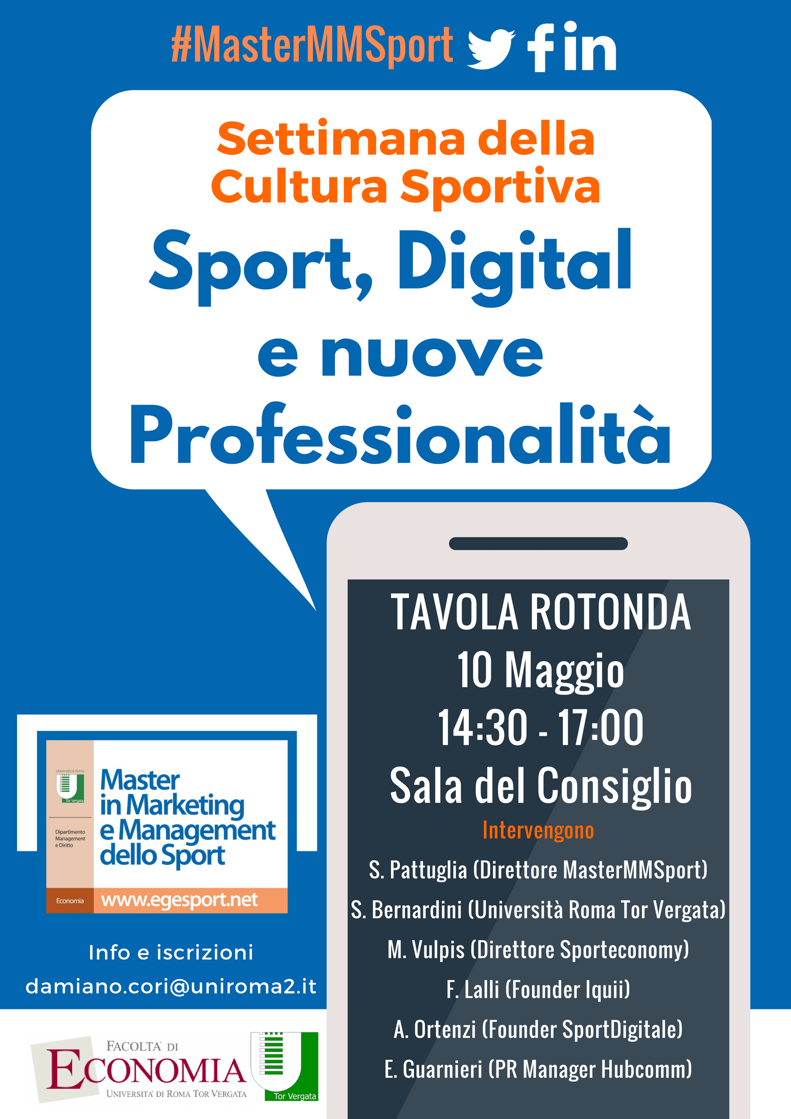 Il Master Universitario in Marketing e Management dello Sport giunto alla XVII edizione, nell’ambito della Settimana della Cultura Sportiva dell’Ateneo di Roma Tor Vergata, organizza una Tavola Rotonda intitolata: Sport, Digital e nuove Professionalità.