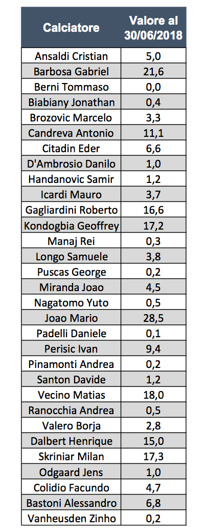 Tra gli altri giocatori, più complesso realizzare plusvalenza con Joao Mario (che avrà un valore di circa 28,5 milioni a bilancio), così come per Gabriel Barbosa (21) e gli acquisti dell’ultima estate (Dalbert e Vecino in particolar modo).