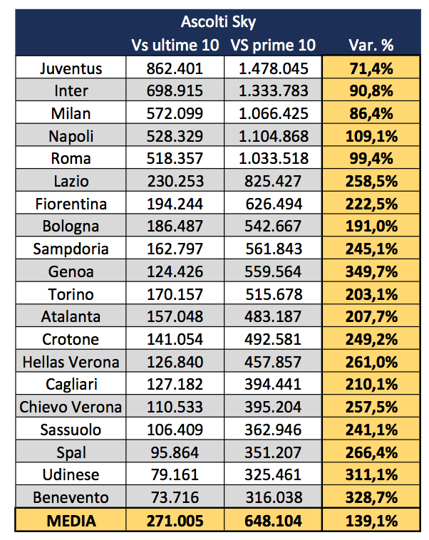 Se per le big l’impatto con le squadre nelle prime 10 posizioni è importante ma non eccessivamente (solo il Napoli raddoppia i dati), per le medio-piccole gli ascolti spiccano il volo: si va dal +191% della Fiorentina fino al +349% del Genoa, con anche Udinese e Benevento che viaggiano oltre il +300%.