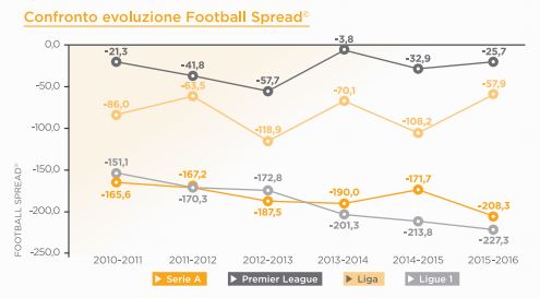 Rispetto alla Bundesliga, la Premier League è quella che mantiene il differenziale negativo mnìinore (-25,7), e anche la Liga contiene la distanza (- 57,9). La Serie A precede solamente la Ligue1 francese (227,3). Il ritardo dell’Italia «è legato in gran parte alle carenze del sistema infrastrutturale»; inoltre si sottolinea che «negli stadi di Serie A oltre 8 milioni di posti restano invenduti, mentre negli altri campionati sono circa 1 milione. Sommando la Serie B, si arriva a 18 milioni, con un potenziale inespresso di 300 milioni di euro».