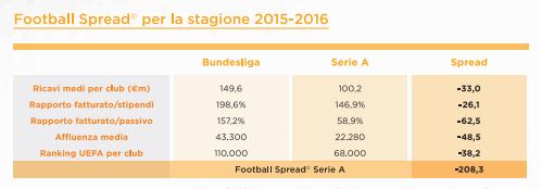 Tra le formule lanciate nel report, infatti, si trova anche il “Football Spread”, un parametro calcolato da qualche anno per riassumere il differenziale fra indicatori economici, patrimoniali e sportivi della Bundesliga – utilizzato come campionato di riferimento –, rispetto agli altri quattro principali europei. Tra questi vi sono: ricavi medi per club, rapporto fatturato/stipendi, rapporto fatturato/passivo, affluenza media negli stadi, ranking Uefa per club. «E’ in linea con quello del sistema Paese, 208,3», ha spiegato Niccolò Donna, responsabile centro studi della Figc, riferendosi allo spread durante la presentazione del rapporto.