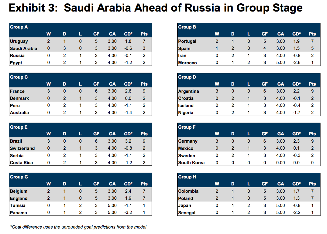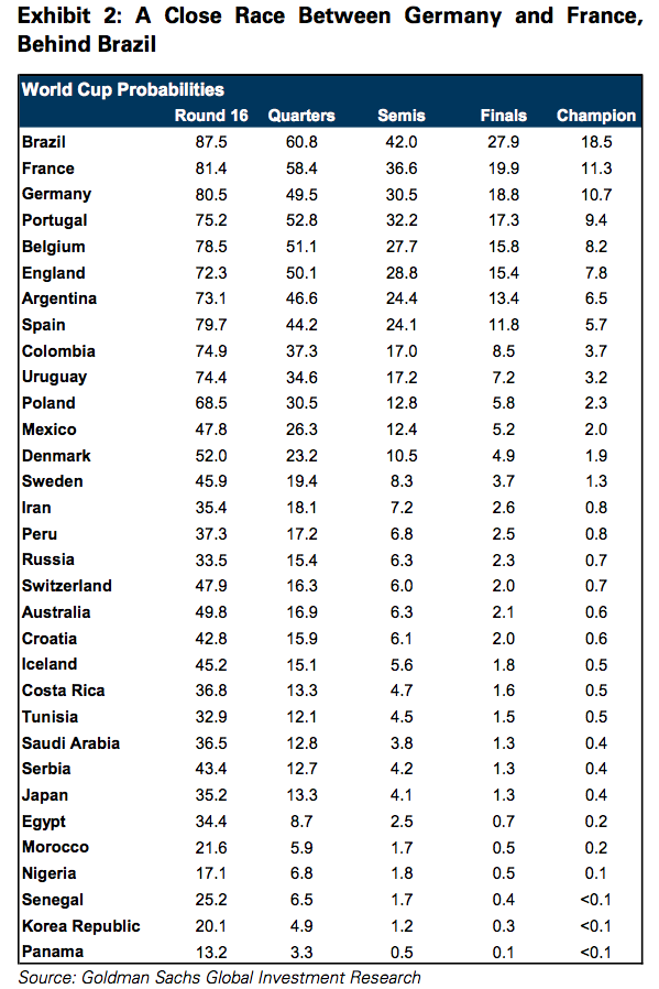 Il Brasile vincerà quindi il suo sesto Mondiale di Calcio battendo la Germania nella finale del prossimo 15 luglio. Secondo l’indagine l’atto finale del torneo sarà Brasile-Germania, a seguito di due semifinali tra Brasile e Francia da una parte e Germania-Portogallo dall’altra. Guardando alle statistiche, Goldman Sachs “vede” un torneo piuttosto deludente per Spagna e Argentina (entrambe eliminate nei quarti di finale) e la conferma dello scarso feeling dell’Inghilterra con la Coppa del Mondo (anch’essa potrebbe uscire ai quarti di finale). Sottotono anche il torneo dei padroni di casa della Russia che difficilmente supereranno la fase preliminare.