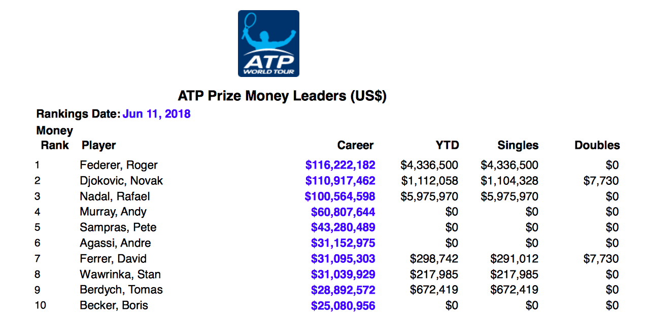 Davanti allo spagnolo c’è anche il serbo Novak Djokovic, che ha approfittato della crescita dei premi nelle ultime stagioni: nel 2015, ad esempio, ha guadagnato ben 21 milioni di dollari.