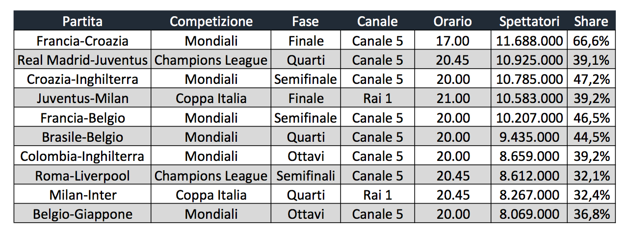 Nella top ten sono presenti sei gare dei Mondiali, due gare di Champions League e due gare di Coppa Italia: la finale tra Juventus e Milan e i quarti con il derby di Milano tra Milan e Inter.