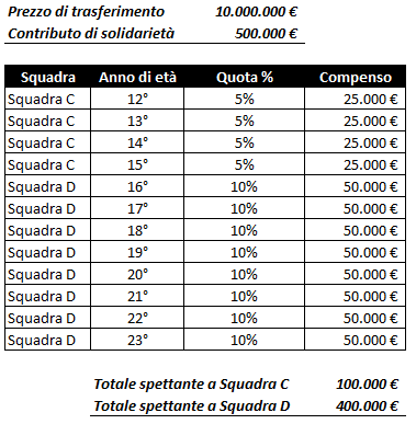 Si ipotizza che la società A e la società B accordino un prezzo per il trasferimento pari a 10 milioni di euro, e che lo stesso calciatore abbia un’età superiore a 23 anni per semplicità. Lo stesso giocatore, si presume sia stato tesserato per una squadra C fino al 19° anno di età e per una squadra D fino al 23° anno di età. Questa sarebbe la ripartizione: