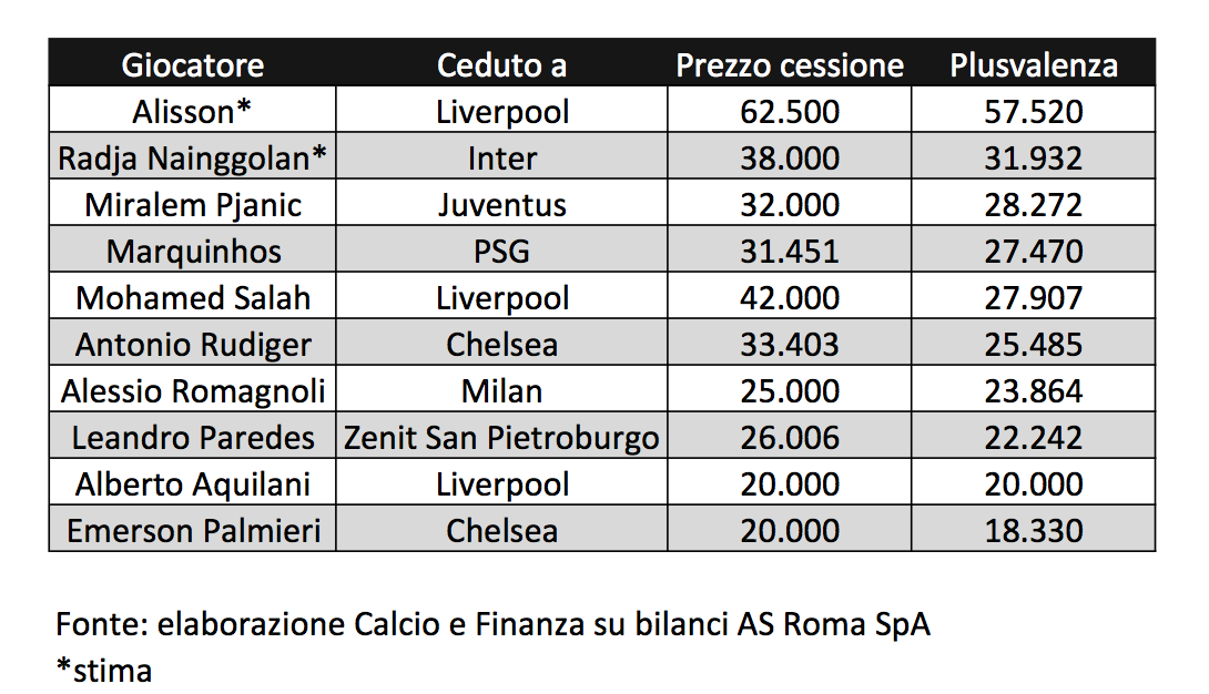 Superata un’altra cessione di questa estate, ovverosia l’affare che ha portato Radja Nainggolan all’Inter, con una plusvalenza pari a 31,9 milioni di euro.