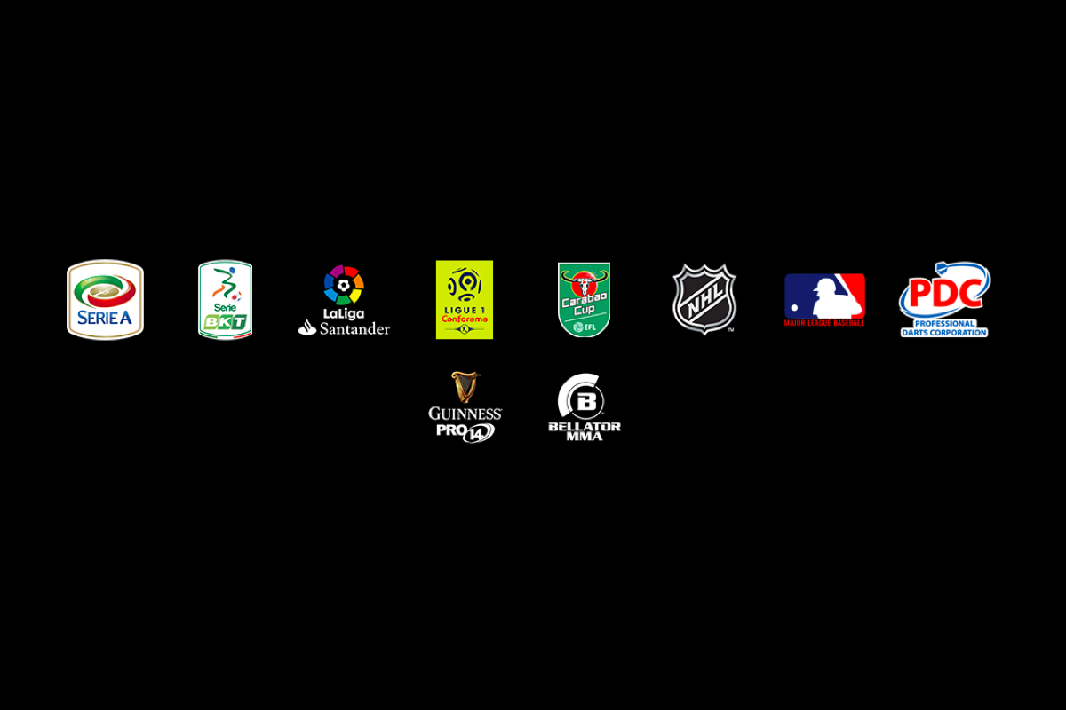 Non solo calcio, quindi, con Liga, Ligue 1 e Carabao Cup a completare la proposta di Serie A e Serie B, ma anche sport americani come la Major League Baseball e la National Hockey League, la Professional Darts Corporation (i tornei di freccette), il Pro14 di Rugby (in cui partecipano anche due squadre italiane, Benetton e Zebre) e la Bellator MMA (arti marziali miste).