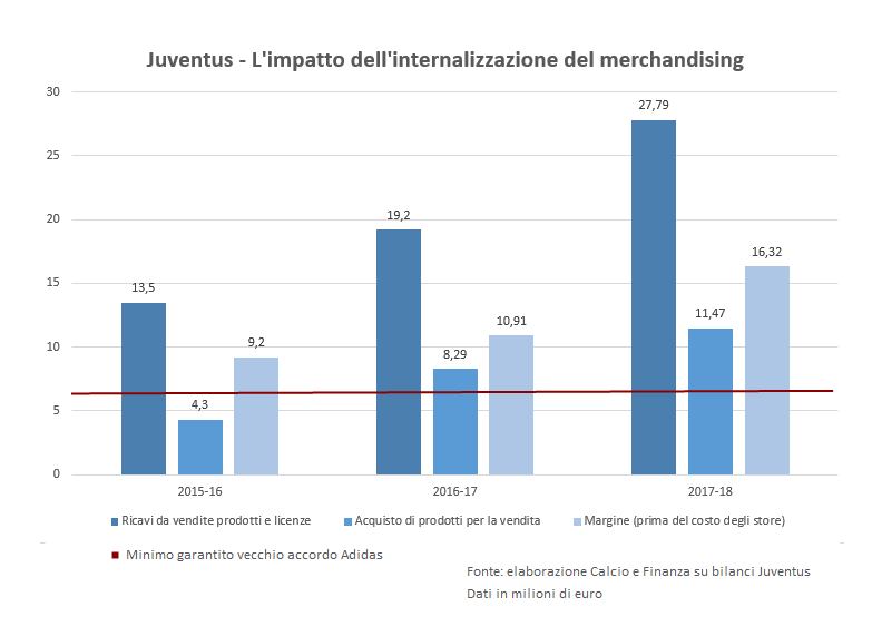 La stessa Adidas, sempre al netto del merchandising, versa annualmente alla Juventus, alla luce dell’accordo iniziato nella stagione 2015-2016 e in scadenza nel 2020-2021, “solo” 23,25 milioni di euro.