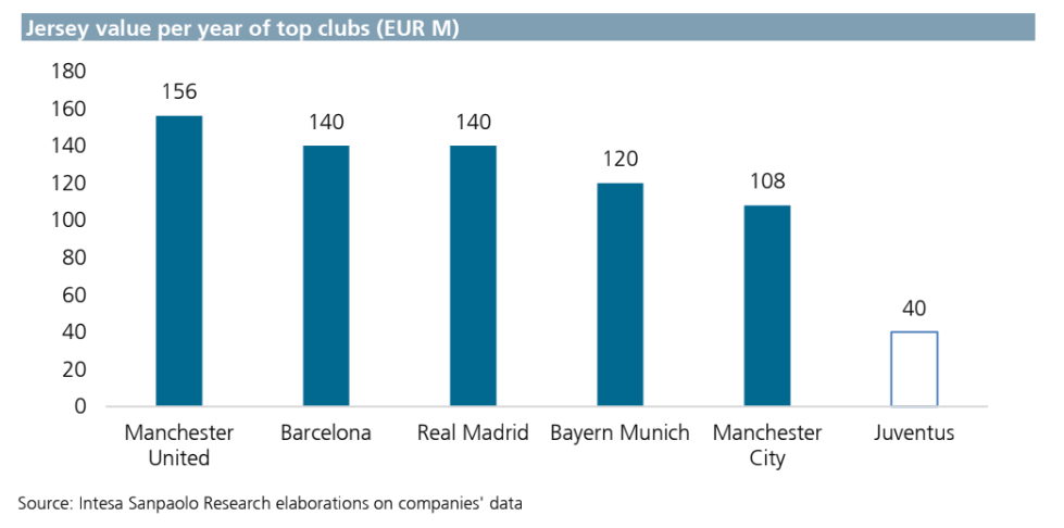 Discorso analogo per il main sponsor con Emirates che versa al Real 70 milioni di euro a stagione a fronte dei 17 milioni versati annualmente dal gruppo FCA attraverso il marchio Jeep ai bianconeri (nell’esercizio 2017-2018 il contributo di FCA è stato di 21 milioni).