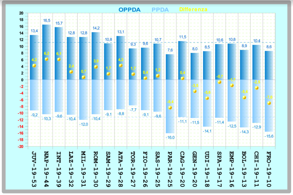 I numeri in alto (colonne più scure) sono l’opposto e cioè, sempre prendendo la Juventus come esempio, 13,4 rappresenta il numero di passaggi fatti mediamente dalla Juventus prima di perdere palla. Più alto è e meglio è.