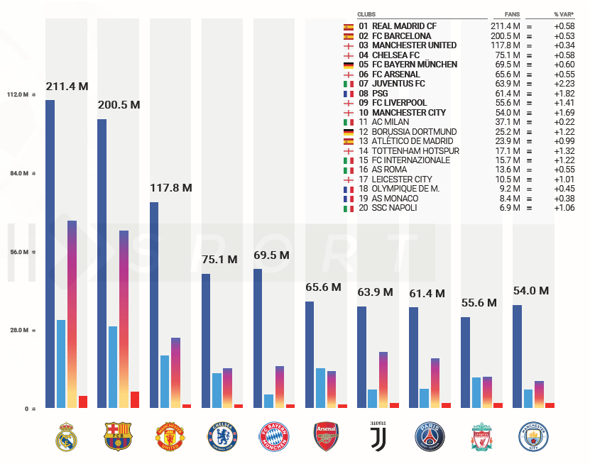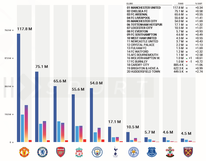 Una fanbase ampia che la società cerca di valorizzare e monetizzare. Primao posto per seguito in Premier League e terzo in Europa. Dietro solo le due potenze spagnole Real Madrid e Barcelona. La presenza sui canali online si concentra, però, anche nei territori asiatici. Nei paesi in cui i social media di riferimento sono altri rispetto a Facebook, Instagram, Twitter e Youtube. Si spiegano così i 9.3 milioni di followers su SinaWeibo (social di riferimento in Cina) e i 5.1 milioni su TencentWeibo (microblogging sempre cinese).