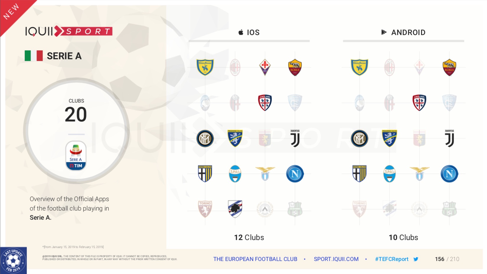Nel dettaglio, quindi, il nuovo Report analizza il mondo delle app relative alle squadre delle prime divisioni in Italia, Germania, Spagna, Inghilterra e Portogallo, per un totale di 116 club analizzati. Complessivamente, sono 78 le squadre con una app ufficiale per iOS e 71 quelle che ne hanno una dedicata al sistema operativo Android.