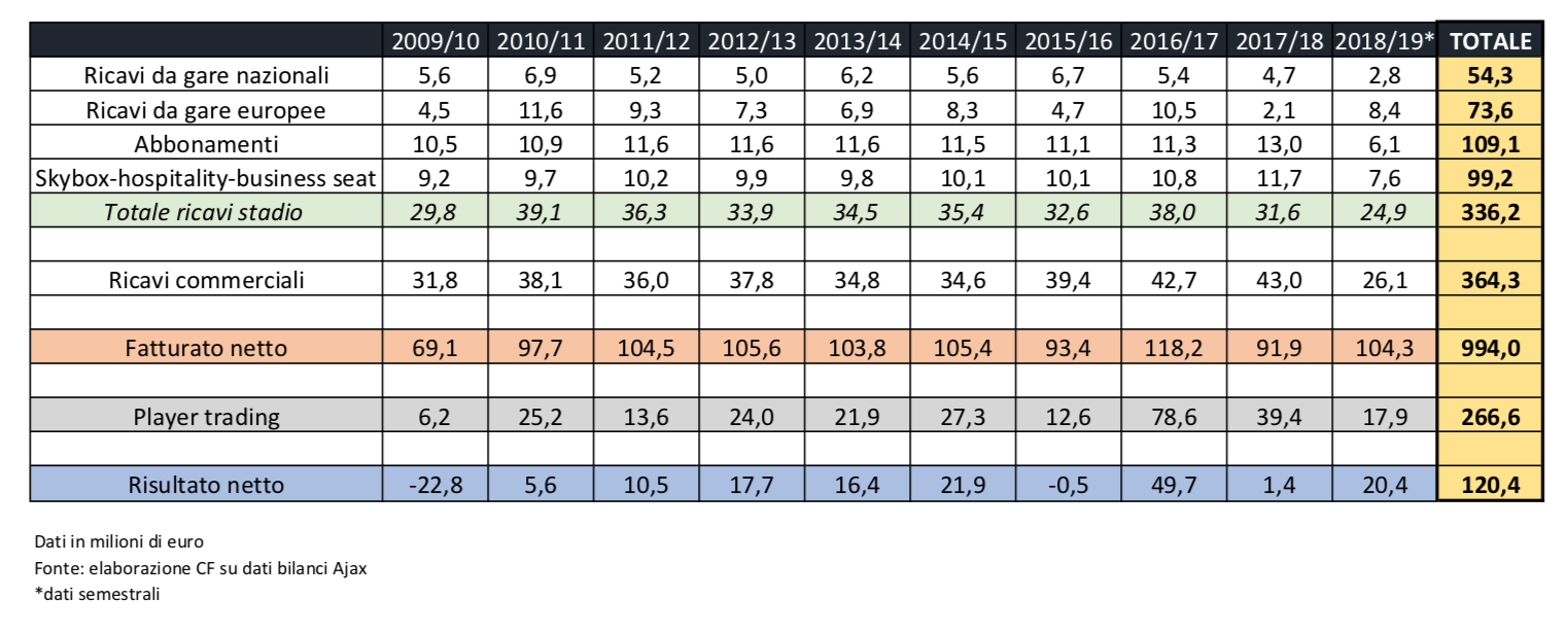 Negli anni, però, il modello Ajax si è trasformato anche a livello economico: le cessioni restano importanti (come per la maggior parte ormai dei club d’Europa, anche tra big di primo livello), ma la struttura da grande azienda è consolidata e permette ai lancieri di mantenere ricavi importanti ogni anno, indipendentemente dalle componenti straordinarie (plusvalenze o la partecipazione alle coppe).