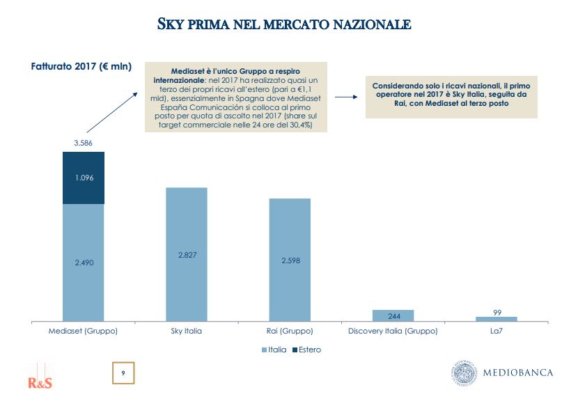 Rapporto Mediobanca sul settore tv – Sky Italia è il primo operatore televisivo in Italia per ricavi. Secondo il focus sul settore TV, relativo al quinquennio 2013-2018) realizzato da R&S Mediobanca, la pay tv del gruppo Comcast è quella che ha registrato maggiori ricavi in Italia (2,827 miliardi di euro) nell’esercizio 2017, davanti a Rai (2,598 miliardi di euro) e Mediaset (2,49 miliardi di euro, al netto delle attività spagnole).