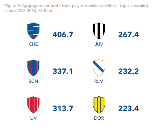Con le entrate nette generate dalle attività di trasferimento che rappresentano quasi un quinto dei ricavi operativi complessivi, Chelsea e Juventus sono il secondo e il terzo club in questa specifica classifica.