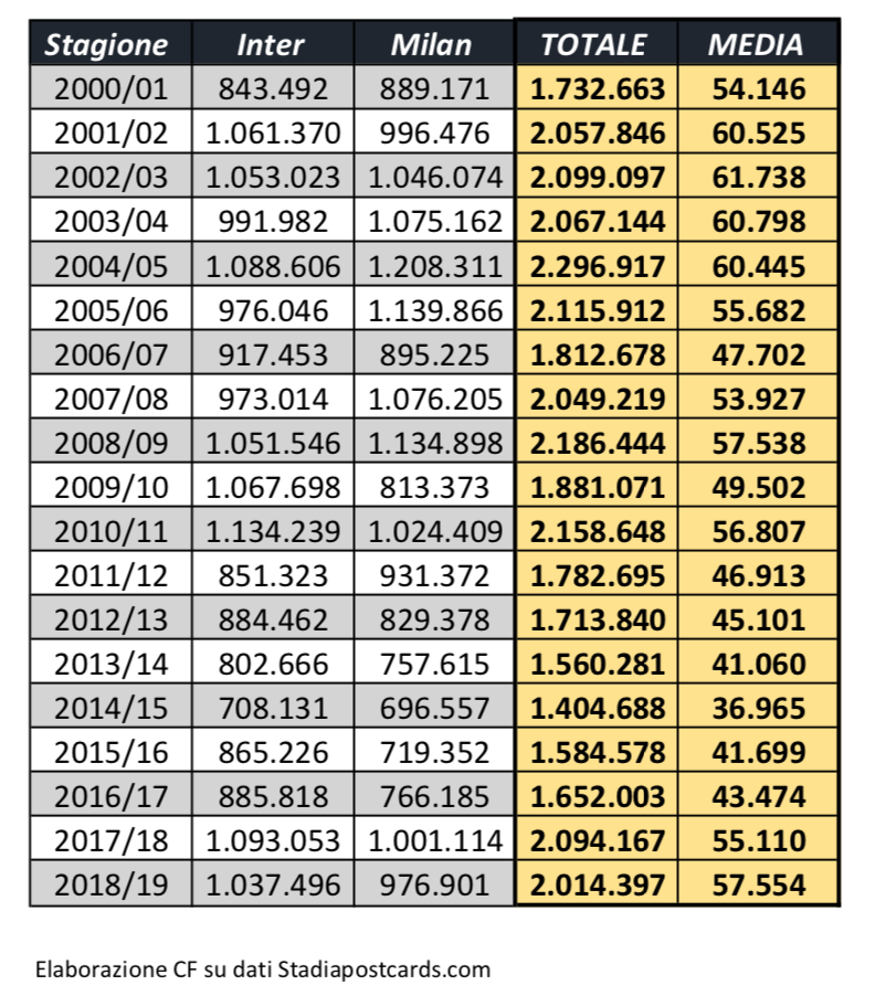 Nel caso in cui sia Inter che Milan chiudessero la stagione con 60mila spettatori presente nelle gare con Empoli e Frosinone, la media salirebbe a 57.686 spettatori aggregati.