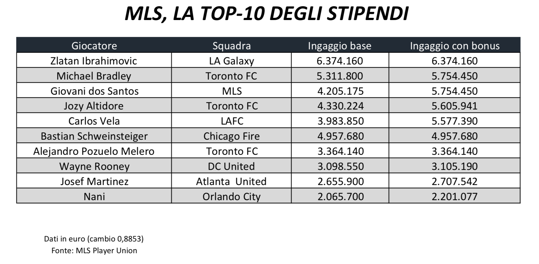 Completano la top 10 Bastian Schweinsteiger (Chicago Fire, 4,9 milioni di euro), Alejandro Pozuelo Merelo (Toronto Fc, 3,3 milioni), Wayne Rooney (DC United, 3,1 milioni), Josef Martinez (Atlanta United, 2,7 milioni) e Nani (Orlando City, 2,1 milioni).