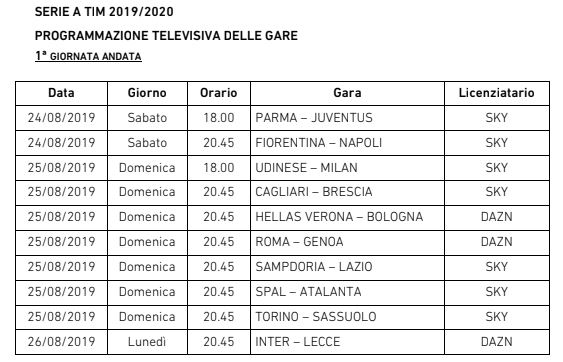 La seconda giornata presenterà anche il primo big match di stagione. Juventus e Napoli si affronteranno alle ore 20.45 all’Allianz Stadium, con diretta su Sky. Questa la programmazione completa dei primi due turni di campionato: