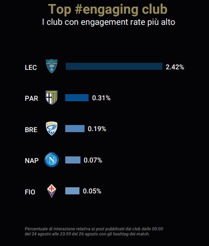 Da un punto di vista metodologico, per il calcolo dei club e giocatori più menzionati, dell’engagement rate (calcolato come la media degli engagement rate dei singoli post della squadra, ottenuti dividendo le interazioni sui post per la fanbase social) e delle squadre e degli utenti più attivi, sono stati presi come riferimento i tweet contenenti almeno uno degli hashtag delle partite in programma.