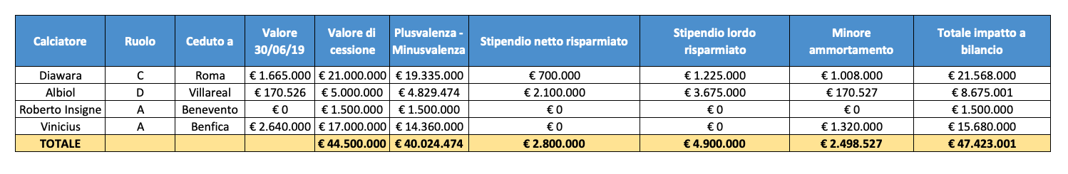 Nella seguente tabella è riportato il dettaglio dei nuovi acquisti e la stima del loro impatto sul bilancio 2019-2020 del Napoli.