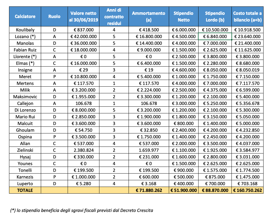 Il dato è inferiore ai 161 milioni indicati nella precedente stima (CLICCA QUI PER L’ANALISI SUL NAPOLI DEL 24 LUGLIO) per via di un’affinamento del metodo di calcolo dello stipendio lordo (voce che non comprende tuttavia TFR e oneri previdenziali, ma solo l’Irpef).