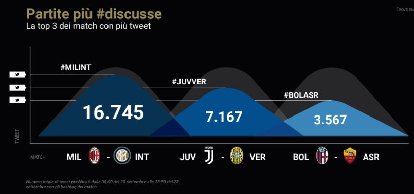 Il match più twittato della quarta giornata è inevitabilmente il derby tra Milan e Inter, che con 16.745 tweet pubblicati tra le 00.00 del 20 settembre e le 23.59 del 22 settembre si posiziona al primo posto. Il calcolo del numero dei tweet prende in considerazione esclusivamente i tweet originali e i loro retweet con commento, non i semplici retweet.
