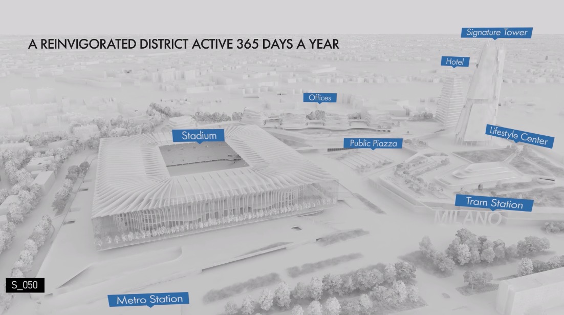 A partire dalla struttura dello stadio (già filtrata negli ultimi giorni) ma anche del progetto di riqualificazione dell’intera area, un distretto “rinvigorito e attivo 365 giorni l’anno” con stadio, uffici, hotel, un centro commerciale e un grattacielo.