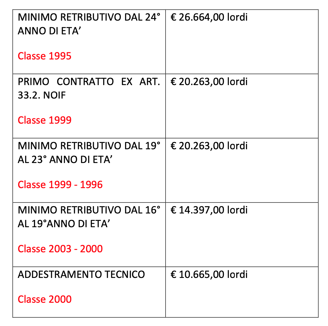 - Minimo retributivo dal 19° al 23° anno di età (Classe 1999 – 1996) € 20.263,00 lordi;