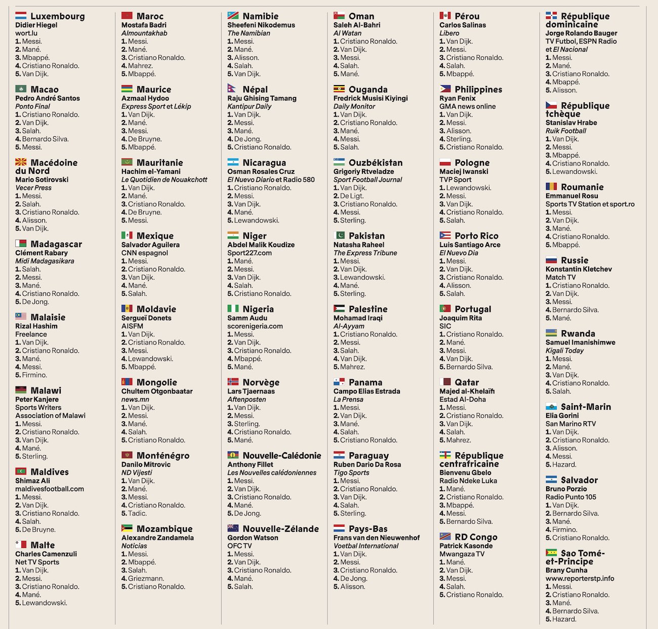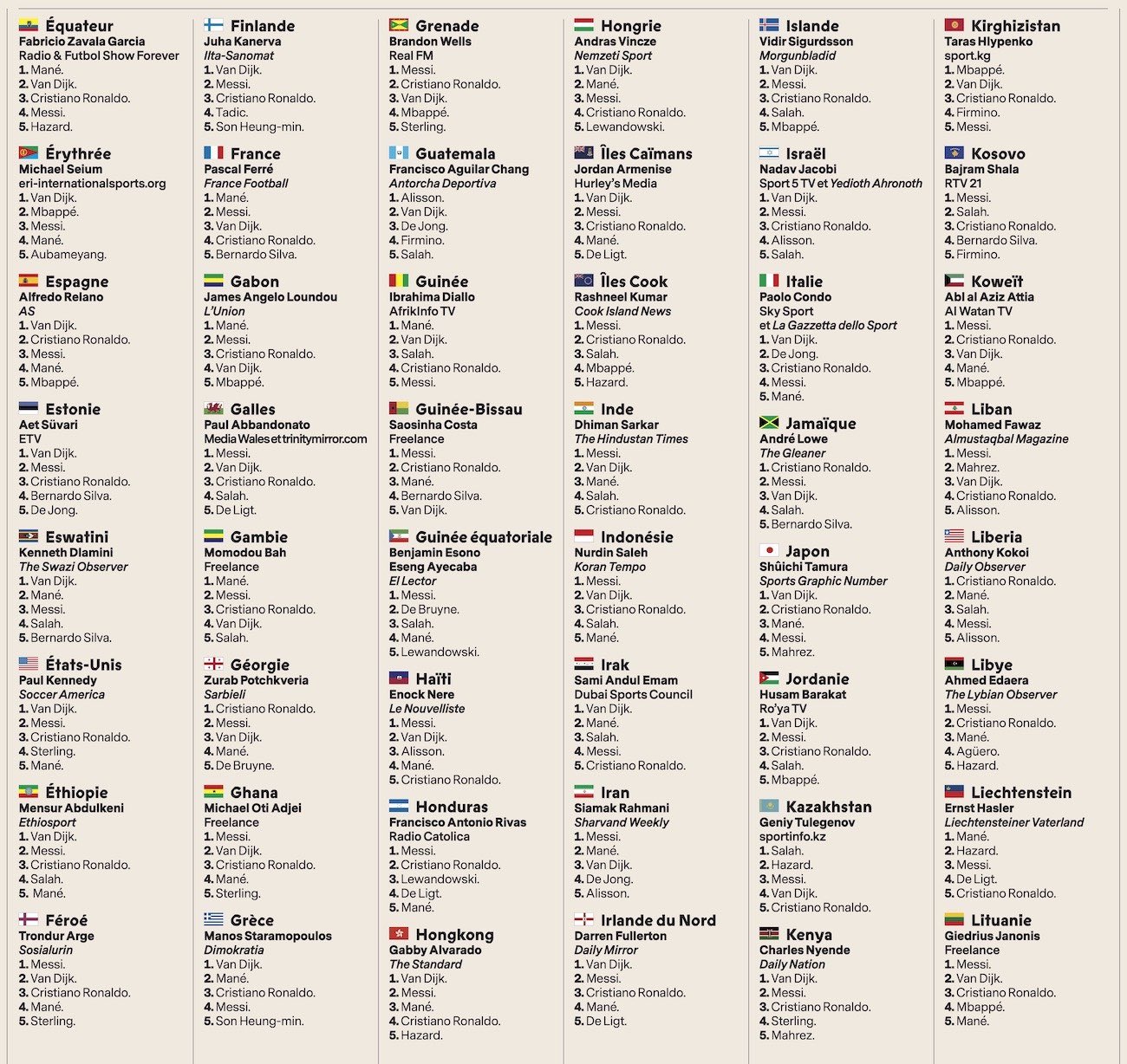 Chi è stato votato più volte per primo è stato Van Dijk, con 69 voti come primo, seguito da Messi (61), Cristiano Ronaldo e Manè (17 ciascuno).