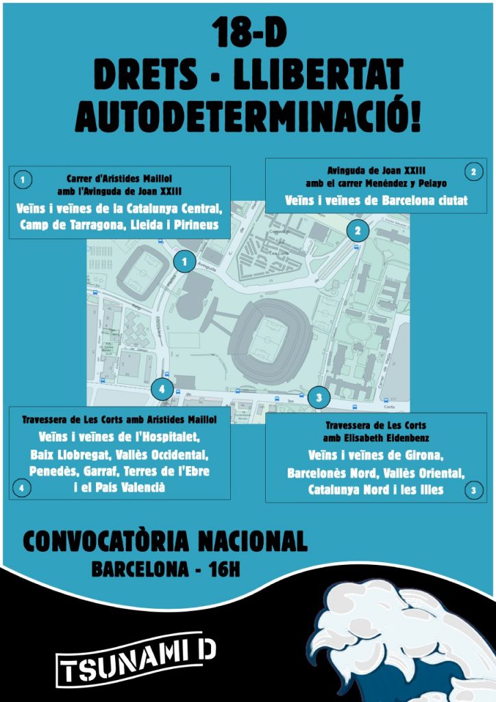 Per tentare di realizzare l’iniziativa, la protesta di Tsunami Democratic si concentrerà su Avenida Juan 23 all’altezza della Masia, su Avenida Juan 23, all’angolo con Arístides Maillol (dove si trovava il Mini Estadi), in Aristides Maillol, all’angolo con Travessera de les Corts, e in Travesera de les Corts, all’angolo con Elisabeth Eidenbenz.