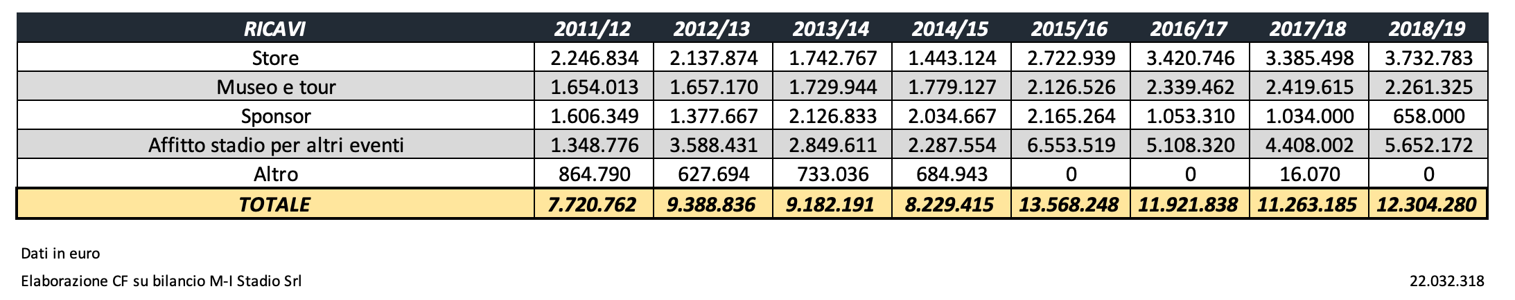 San Siro nella stagione 2018/19 ha avuto ricavi da attività commerciali, sponsorizzazioni, museo e grandi eventi (escludendo quindi l’affitto versato da Inter e Milan) per 12,3 milioni di euro, in aumento dagli 11,2 milioni della stagione 2017/18.