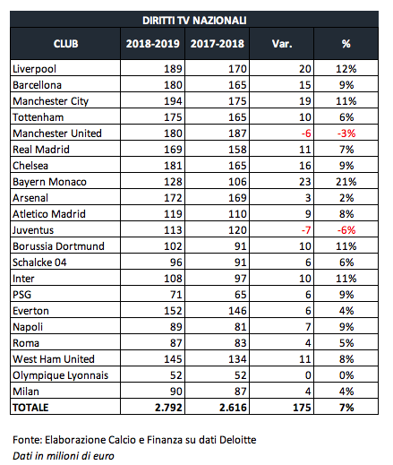 «Negli ultimi cinque anni, a livello aggregato, i ricavi da proventi televisivi dei top 20 club sono aumentati ad un tasso di crescita annuo composto dell’11%, l’aumento maggiore tra tutti i flussi d’entrata», scrivono gli esperti di Deloitte nelle note a commento della Football Money League.