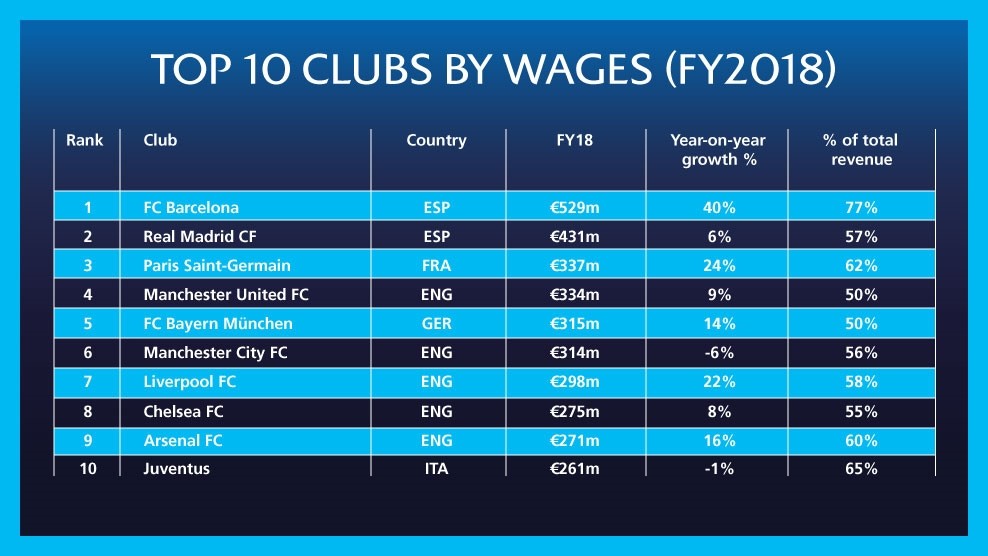 Il rapporto preliminare del 2019 indica che, per la prima volta, le prime 30 squadre genereranno oltre metà dei ricavi di tutti i club di massima divisione. D’altro canto, la spesa salariale dei 98 club dei primi cinque campionati è aumentata di oltre 1 miliardo di euro (a rappresentare l’88% dell’intera crescita salariale). I suddetti club hanno registrato complessivamente l’85% delle spese lorde per i trasferimenti e il 75% dei guadagni per trasferimenti nelle massime divisioni.