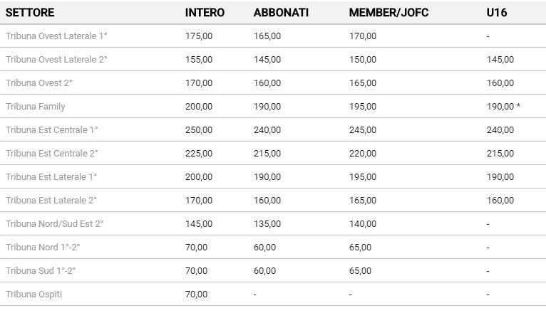 Per quanto riguarda i prezzi dei biglietti, la cifra minima è pari ai 60 euro che gli abbonati dovranno spendere per la Tribuna Sud. Da qui si sale fino ad un massimo di 175 euro per un posto nella Tribuna Ovest Laterale 1°. Per gli Under 16 previsti prezzi della stessa fascia studiata per gli abbonati.