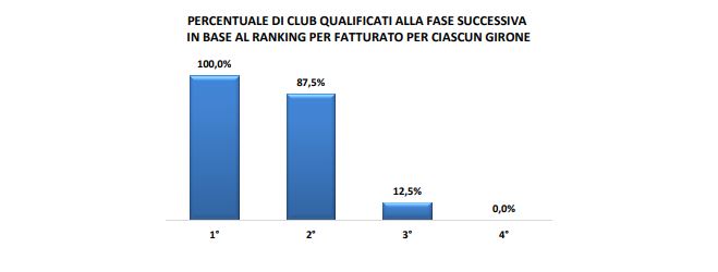 Nei gironi E ed F (88,9%) si sono registrate le percentuali più alte di vittorie per i club con il maggior fatturato, mentre nel girone C (75%), la percentuale più bassa.
