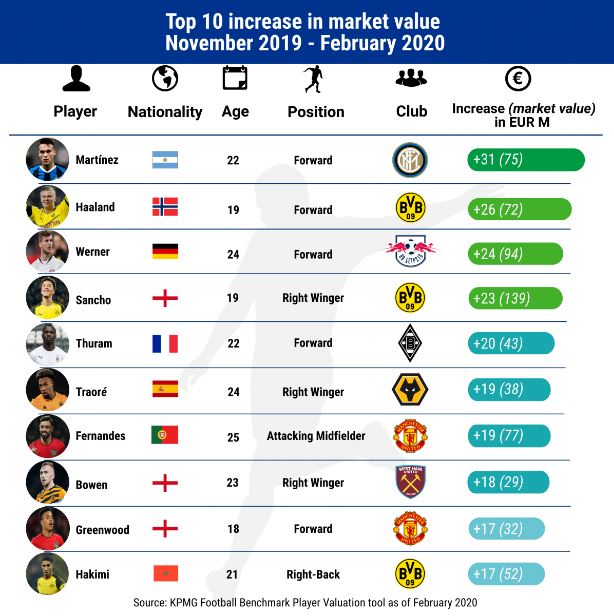 Quattro dei primi 10 giocatori che hanno visto crescere maggiormente il loro valore hanno meno di 22 anni, e tra questi il più giovane è Mason Greenwood del Manchester United. Il giocatore più anziano nella graduatoria è il nuovo centrocampista dello United, il portoghese Bruno Fernandes (25 anni).