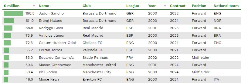 Gli inglesi dominano la top 10 di questa classifica. Oltre al già citato Jadon Sancho, in graduatoria si trovano anche Callum Hudson-Odoi (72 milioni di euro), Mason Greenwood (50 milioni di euro) e Phil Foden (50 milioni di euro). Due i brasiliani (Rodrygo e Vinicius), un norvegese (Haland), uno spagnolo (Ferran Torres, 55,2 milioni), un francese (Camavinga, 53 milioni) e un italiano (Moise Kean, 46 milioni).