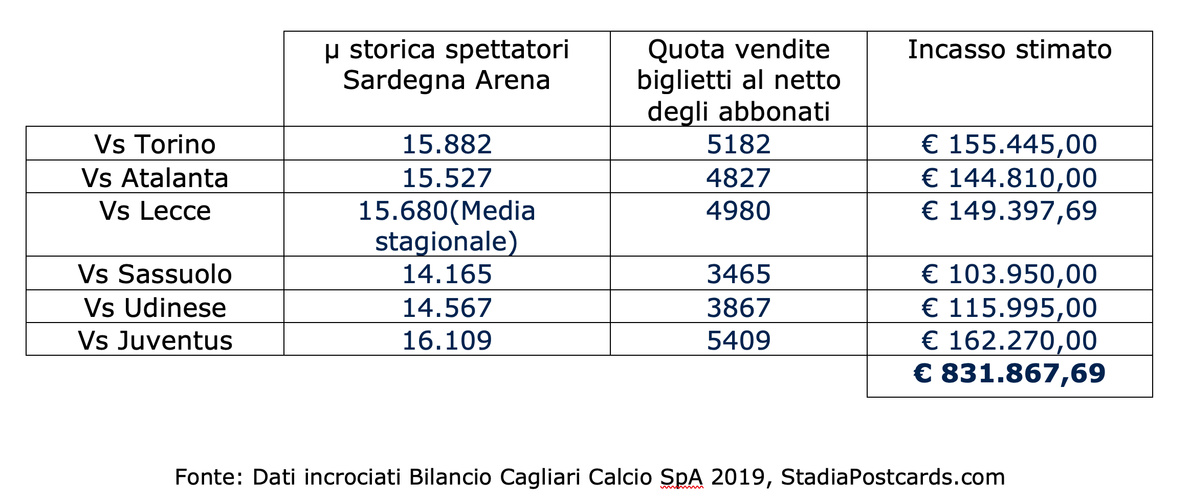 Nel caso in cui non si riuscisse a riprendere il campionato – ma anche in caso di partite a porte chiuse – il Cagliari, non disputerebbe le restanti 6 gare casalinghe: Torino, Atalanta, Lecce, Sassuolo, Udinese e Juventus.
