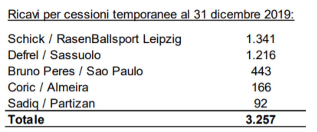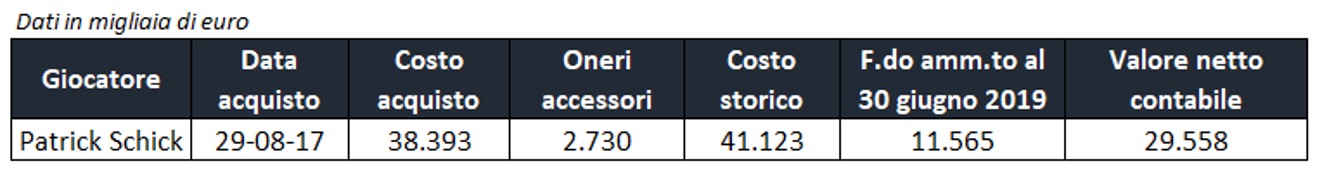 Al 31 dicembre 2019 la Roma ha incassato 1.341 milioni di euro come ricavo per cessione temporanea e il valore netto contabile di Schick al 31 dicembre è pari a 24.592 milioni, per effetto di maggiori ammortamenti (4.967 milioni) registrati nei primi 6 mesi della s.s. 2019/2020.