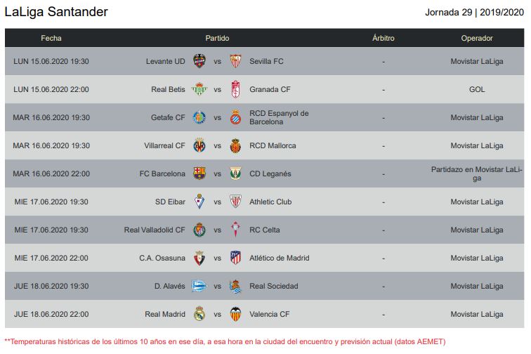 Il 29° turno del massimo campionato spagnolo si svolgerà tra lunedì 15 giugno e giovedì 18 giugno. Lo scontro tra Levante e Siviglia è in programma lunedì alle 19:30, mentre questa giornata si concluderà con lo scontro tra Real Madrid e Valencia, in programma giovedì alle 22.