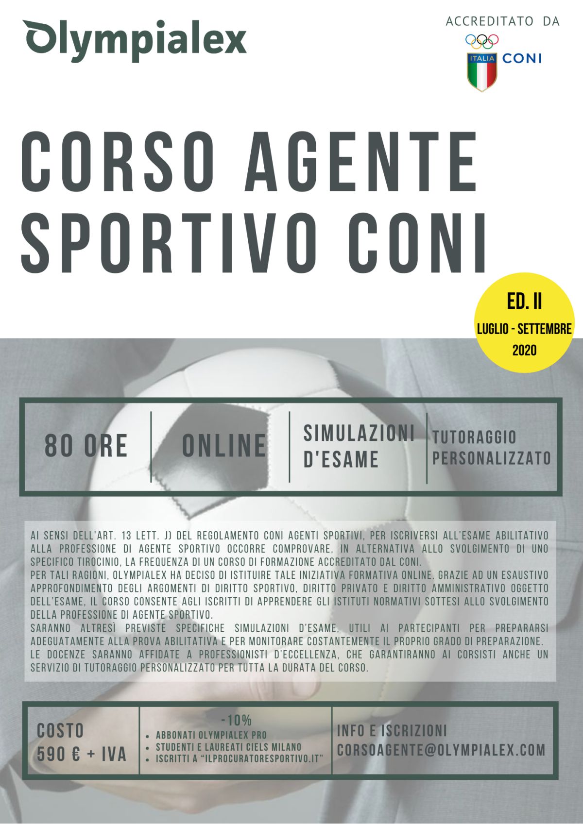 Per tali ragioni Olympialex, portale internazionale di diritto sportivo, ha istituito il “Corso Agente Sportivo”, in modalità e-learning e della durata di 80 ore. Grazie a un esaustivo approfondimento di tutti gli argomenti di diritto sportivo, diritto privato e diritto amministrativo oggetto della prova d’esame, tale iniziativa formativa consente agli iscritti di apprendere gli istituti normativi sottesi allo svolgimento della professione di Agente Sportivo.