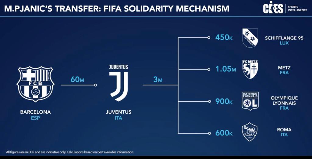 Secondo la normativa FIFA, la Roma percepisce il 10% della somma totale del contributo di solidarietà per ogni anno di età in cui Pjanic ha vestito la maglia giallorossa: il 22° e il 23°. Per ciascun anno, il club capitolino incassa dunque 300 mila euro.