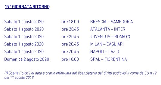 In quest’ottica saranno determinanti le sfide tra Napoli e Lazio e soprattutto quella tra Atalanta e Inter, entrambe in programma sabato 1° agosto alle 20.45. Questa la programmazione completa di anticipi e posticipi dell’ultimo turno: