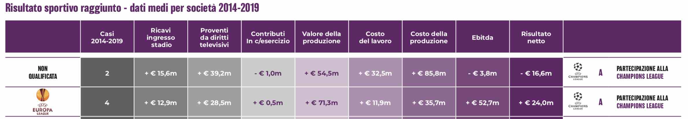 In media un club italiano che nella stagione precedente ha partecipato alla Champions League e che si qualifica solo per l’Europa League potrebbe vedere i propri ricavi contrarsi di circa 21,8 milioni di euro.