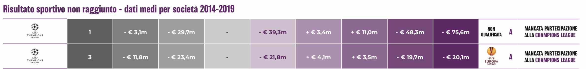 Questo è lo scenario senza dubbio più drammatico. In questo caso la mancata qualificazione alle coppe europee dopo aver preso parte nella stagione precedente alla Champions League ha generato (nell’unico caso rilevato) un risultato netto negativo di 75,5 milioni di euro.