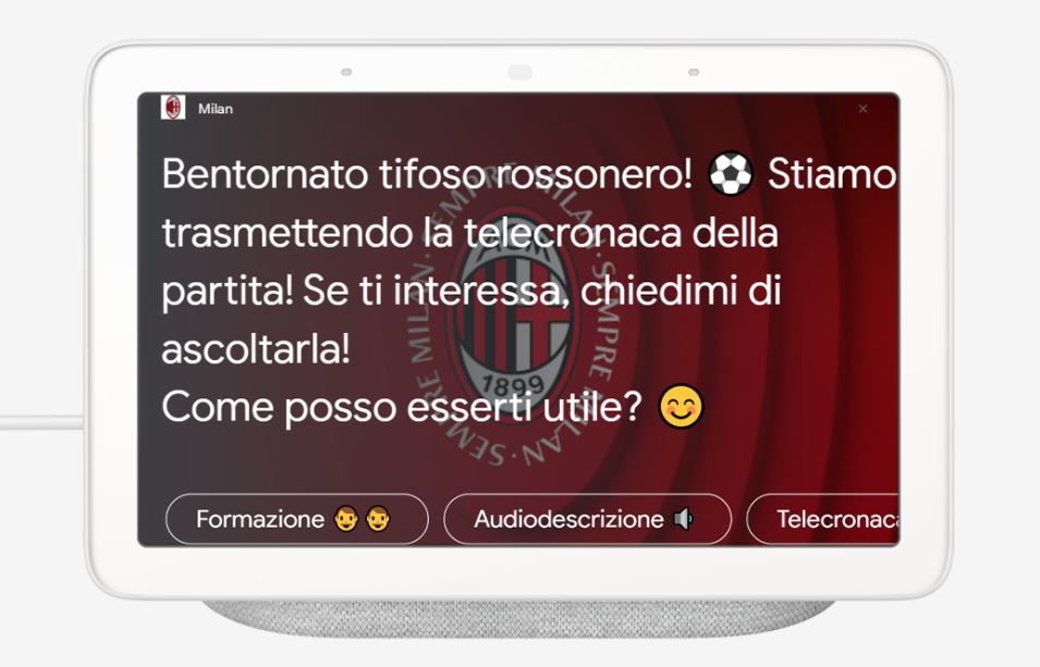 Poco prima di ogni partita sarà possibile ascoltare la formazione ufficiale, come avviene allo stadio, con “Hey Google, chiedi a Milan la formazione”. Durante il match potranno essere riprodotti i cori milanisti, così che i tifosi potranno sostenere la squadra anche da casa: “Hey Google, chiedi a Milan i cori dei tifosi”.